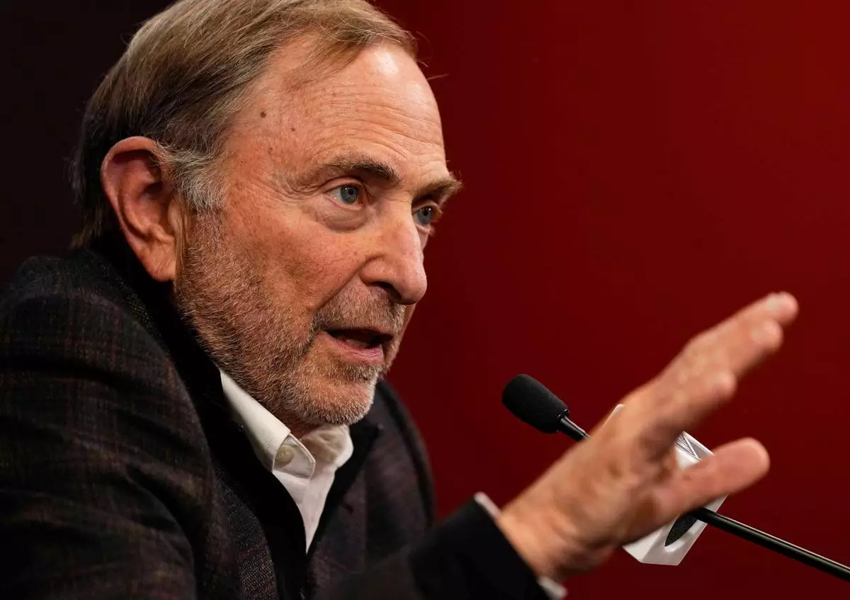 NHL Commissioner Gary Bettman speaks before an NHL hockey playoff game between the Ottawa Senators and the Carolina Hurricanes in Ottawa, Ontario, on Thursday, April 23, 2026. (Justin Tang/The Canadian Press via AP)