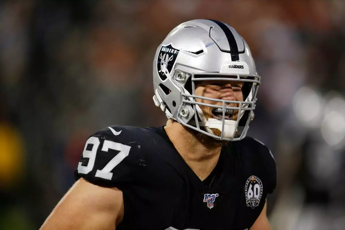 FILE - Oakland Raiders defensive end Josh Mauro (97) during the first half of an NFL football game against the Denver Broncos on Sept. 9, 2019, in Oakland, Calif. (AP Photo/D. Ross Cameron, File)