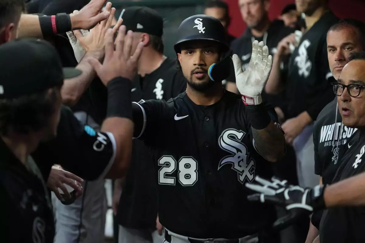 Chicago White Sox' Everson Pereira (28) celebrates with teammates after hitting an RBI sacrifice fly out against the Arizona Diamondbacks in the first inning of a baseball game, Tuesday, April 21, 2026, in Phoenix. (AP Photo/Rick Scuteri)