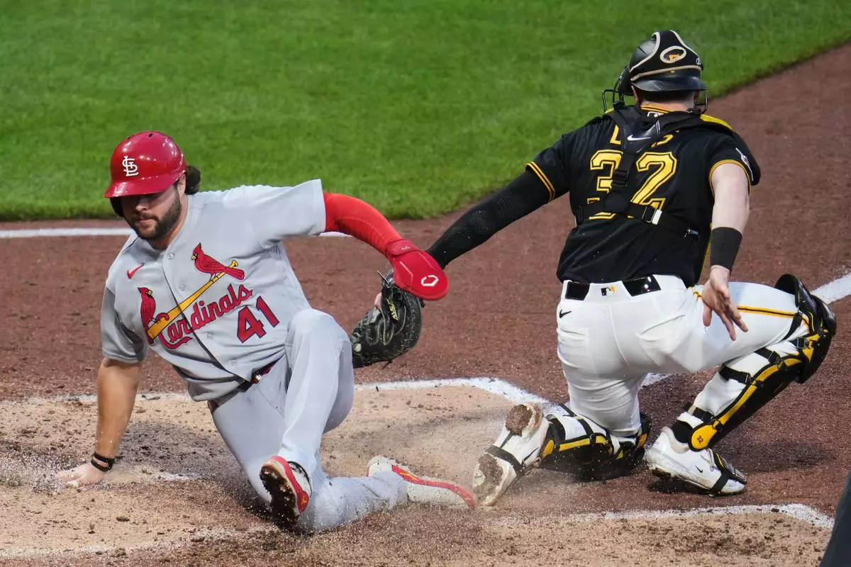 St. Louis Cardinals' Alec Burleson (41) slides safely past the tag attempt by Pittsburgh Pirates catcher Henry Davis, scoring on a sacrifice fly by Nolan Gorman off Pirates pitcher Hunter Barco during the fifth inning of a baseball game in Pittsburgh, Thursday, April 28, 2026. (AP Photo/Gene J. Puskar)