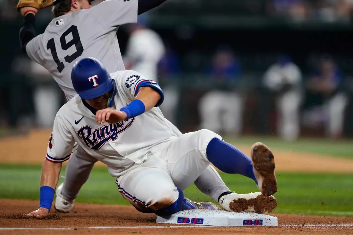 New York Yankees third baseman Ryan McMahon (19) keeps his foot on the bag as he catches the throw on a close play at third where Texas Rangers' Josh Jung, front, was called out on the play in the eighth inning of a baseball game Tuesday, April 28, 2026, in Arlington, Texas. (AP Photo/Tony Gutierrez)
