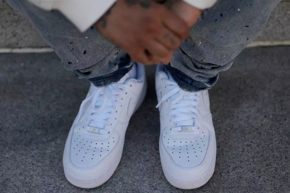 The hands and shoes of Bernard C. are shown during an interview Thursday, April 23, 2026, in Oakland, Calif. (AP Photo/Jeff Chiu)