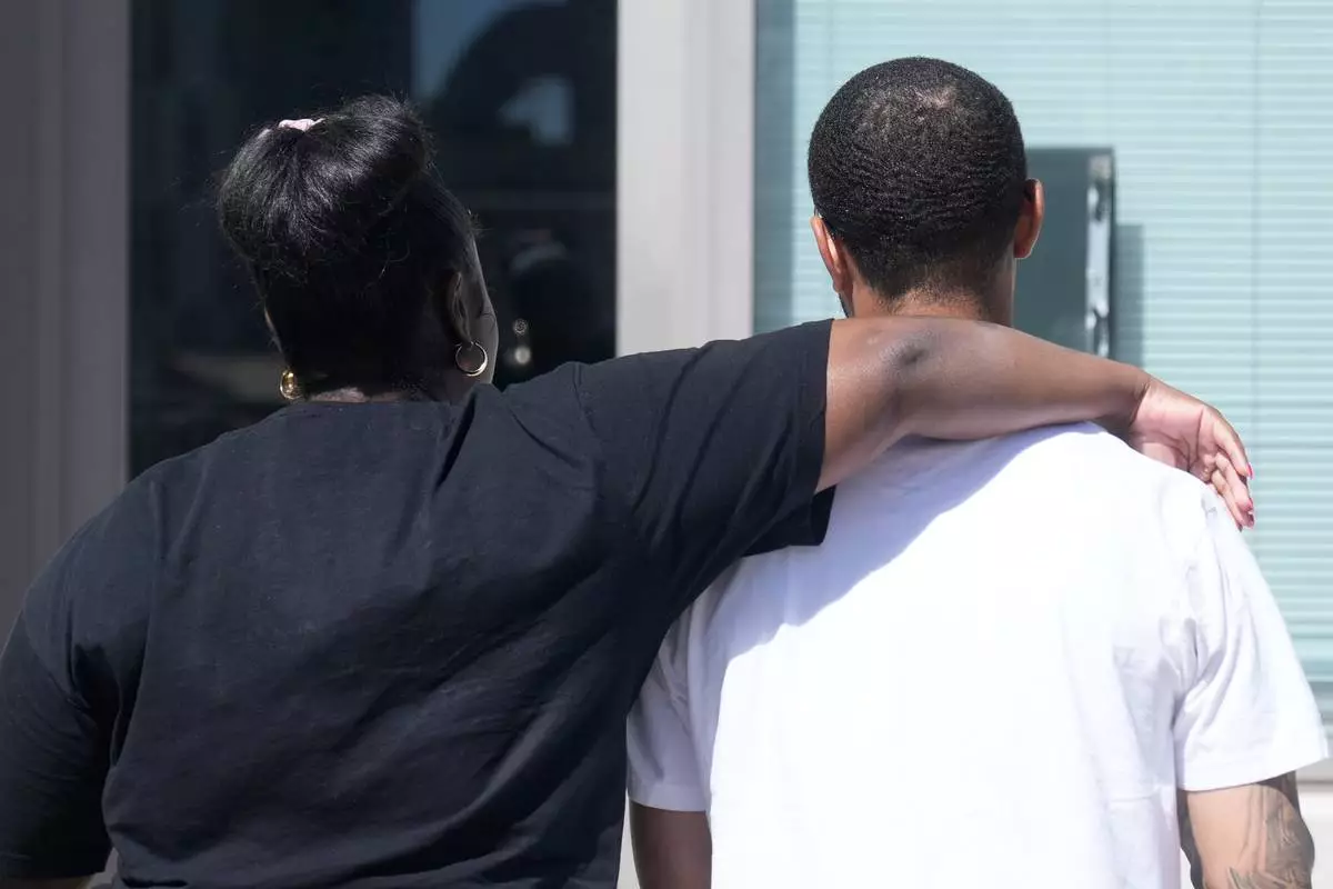 Oakland Ceasefire-Lifeline life coach LaSasha Long, left, puts her arm around Bernard C. during an interview Thursday, April 23, 2026, in Oakland, Calif. (AP Photo/Jeff Chiu)