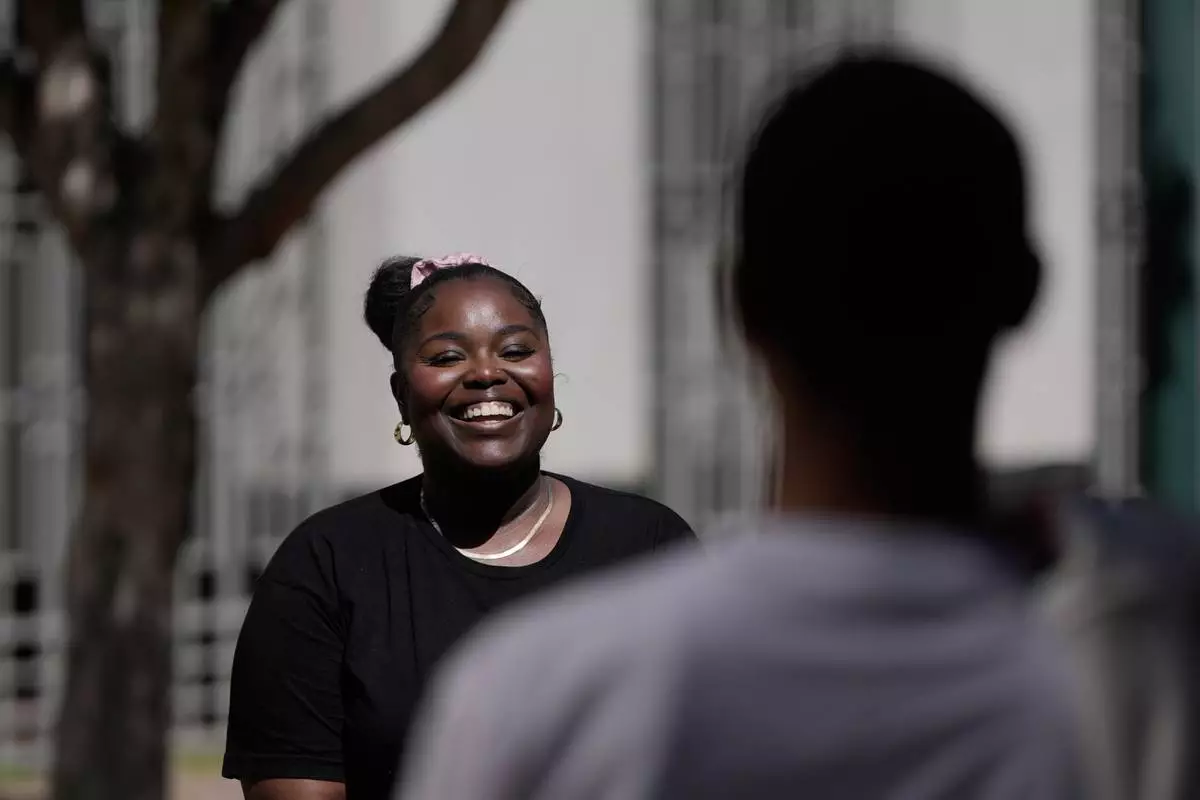 Oakland Ceasefire-Lifeline life coach LaSasha Long, left, laughs with Bernard C. during an interview Thursday, April 23, 2026, in Oakland, Calif. (AP Photo/Jeff Chiu)