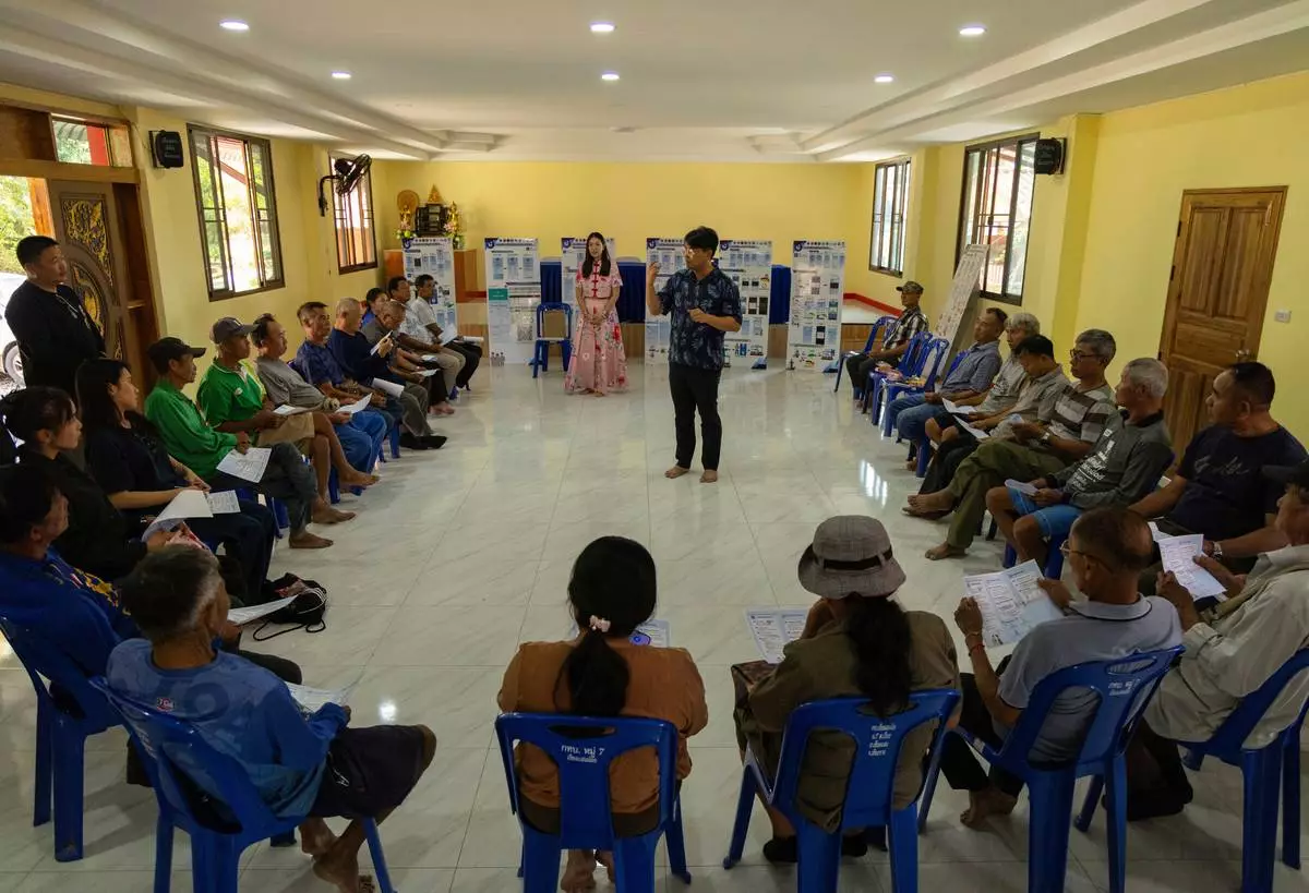 Thanapol Penrat, a professor with Naresuan University, hosts a fish safety app training session with fisherfolk in Chiang Saen, Thailand, Tuesday, Feb. 17, 2026. (AP Photo/Anton L. Delgado)