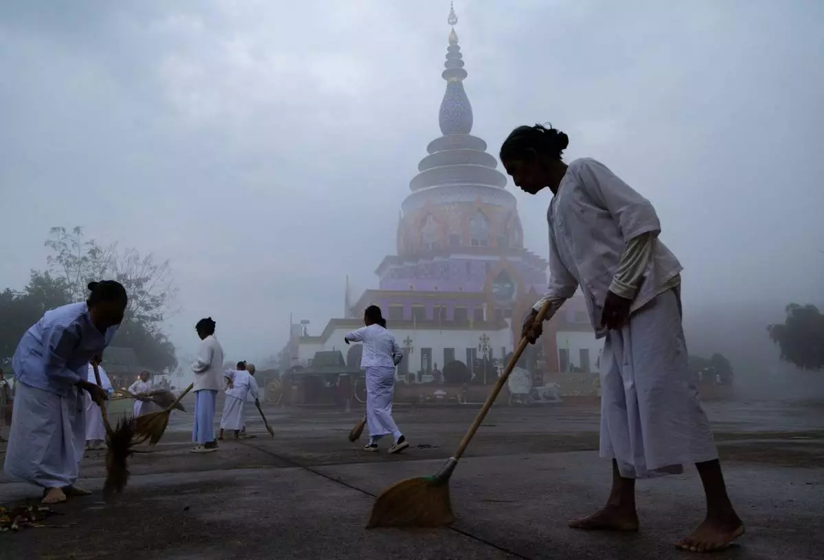 A group of women sweep the grounds of a pagoda in Tha Ton, Thailand, on Feb. 20, 2026. (AP Photo/Anton L. Delgado)
