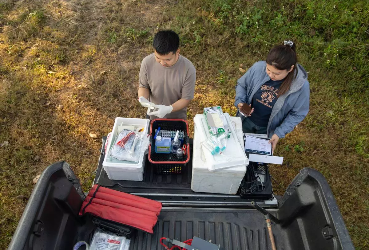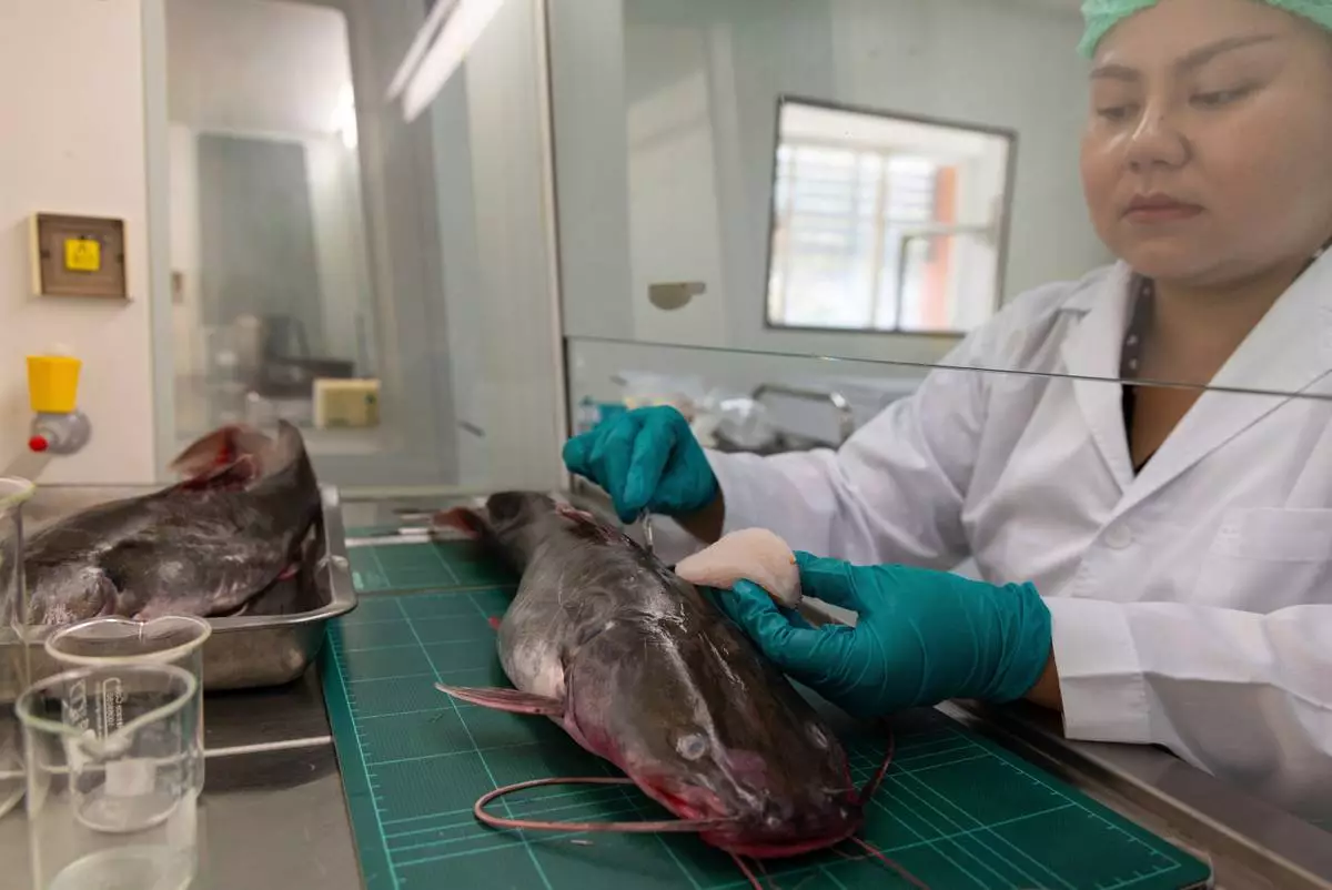 Researcher Warakorn Maneechuket collects a fish sample at a Naresuan University laboratory in Phitsanulok, Thailand, Thursday, Feb. 19, 2026. (AP Photo/Anton L. Delgado)