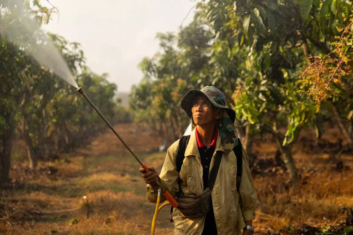 Farmer Lah Boonruang sprays crops on a farm in Tha Ton, Thailand on Feb. 20, 2026. (AP Photo/Anton L. Delgado)