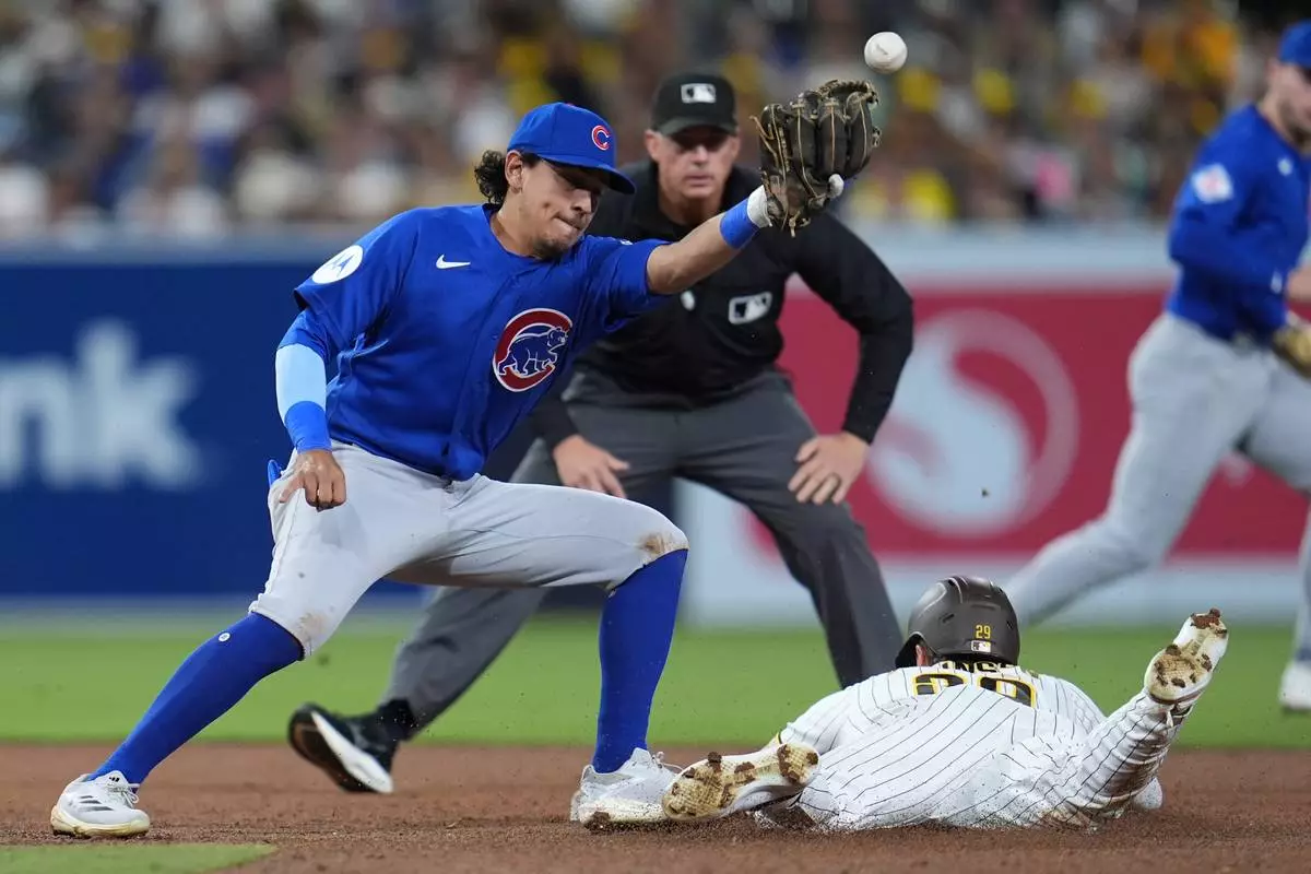 San Diego Padres' Bryce Johnson, below, safely steals second base as Chicago Cubs second baseman Nicky Lopez misses the catch during the fifth inning of a baseball game Tuesday, April 28, 2026, in San Diego. (AP Photo/Gregory Bull)