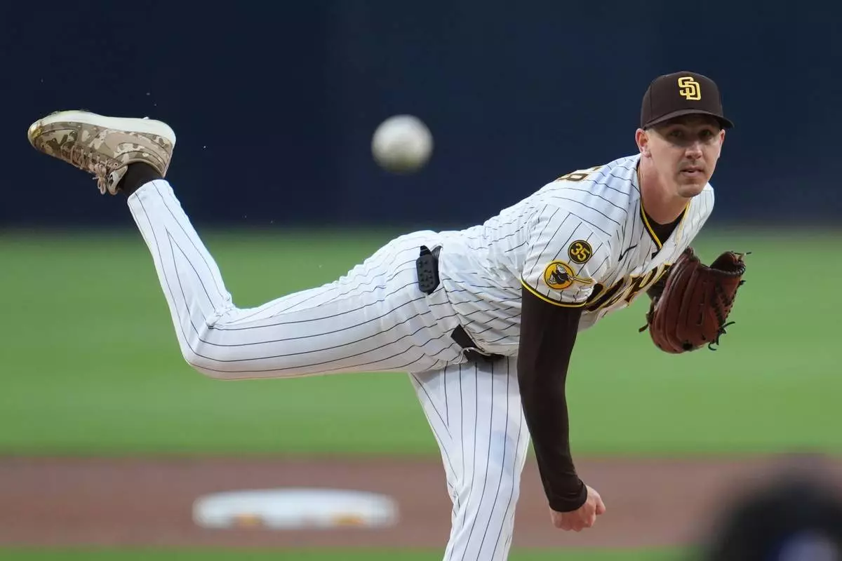 San Diego Padres starting pitcher Walker Buehler works against a Chicago Cubs batter during the first inning of a baseball game Tuesday, April 28, 2026, in San Diego. (AP Photo/Gregory Bull)