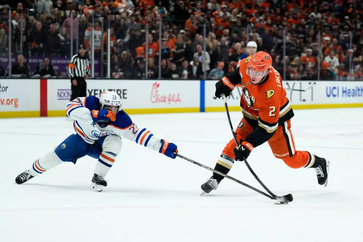 Edmonton Oilers center Matt Savoie, left, blocks the shot by Anaheim Ducks defenseman Jackson LaCombe during the third period of Game 4 in the first round of an NHL hockey Stanley Cup playoff series Sunday, April 26, 2026, in Anaheim, Calif. (AP Photo/Kyusung Gong)