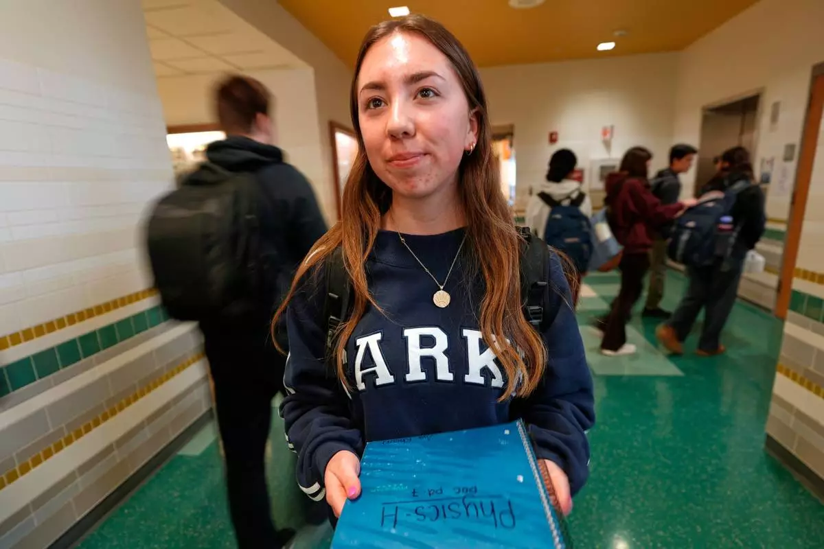 Ava Khouri, a Hanover High School senior who has trained middle school students to take initiatives to stop harmful behavior, poses in a hallway Wednesday, March 25, 2026, in Hanover, Mass. (AP Photo/Robert F. Bukaty)
