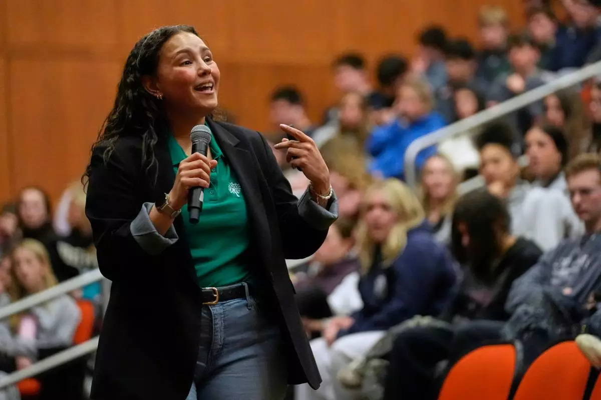 Keely Rogers, a trainer with Sandy Hook Promise's "Say Something" program, gives a presentation on preventing school shootings at Hanover High School, Wednesday, March 25, 2026, in Hanover, Mass. (AP Photo/Robert F. Bukaty)