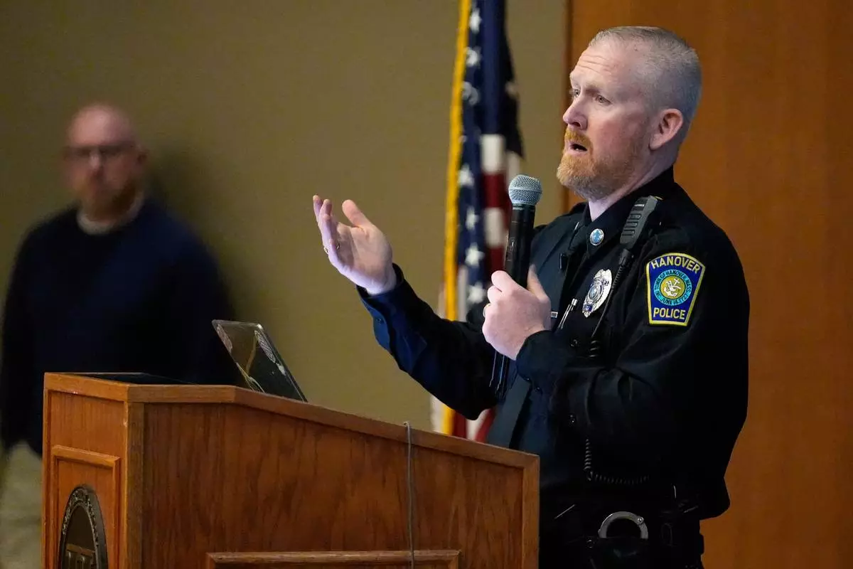 School Resource Officer John Voelkel speaks about ways to prevent school shootings during a presentation of Sandy Hook Promise's "Say Something" program at Hanover High School, Wednesday, March 25, 2026, in Hanover, Mass. (AP Photo/Robert F. Bukaty)