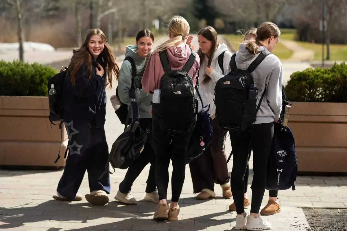 Students enjoy a light moment outside Hanover High School, Wednesday, March 25, 2026, in Hanover, Mass. (AP Photo/Robert F. Bukaty)