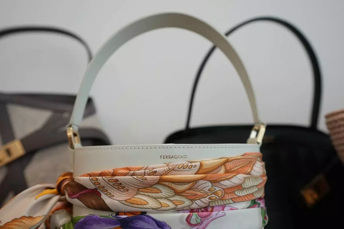 Bags are displayed during an interview with James Ferragamo, Men's and Women's Leather Product Director for the Salvatore Ferragamo group, with Associated Press in Milan, Italy, Wednesday, April 22, 2026. (AP Photo/Antonio Calanni)