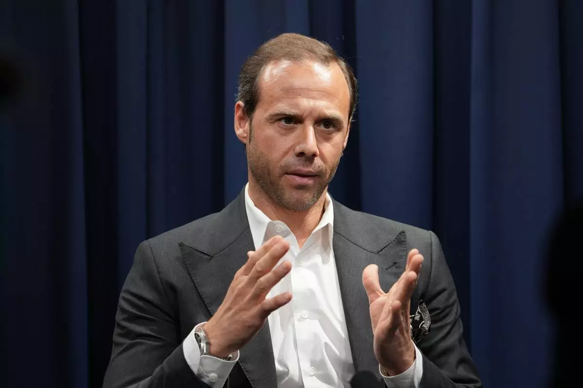 James Ferragamo, Men's and Women's Leather Product Director for the Salvatore Ferragamo group, talks with journalist during an interview with Associated Press in Milan, Italy, Wednesday, April 22, 2026. (AP Photo/Antonio Calanni)