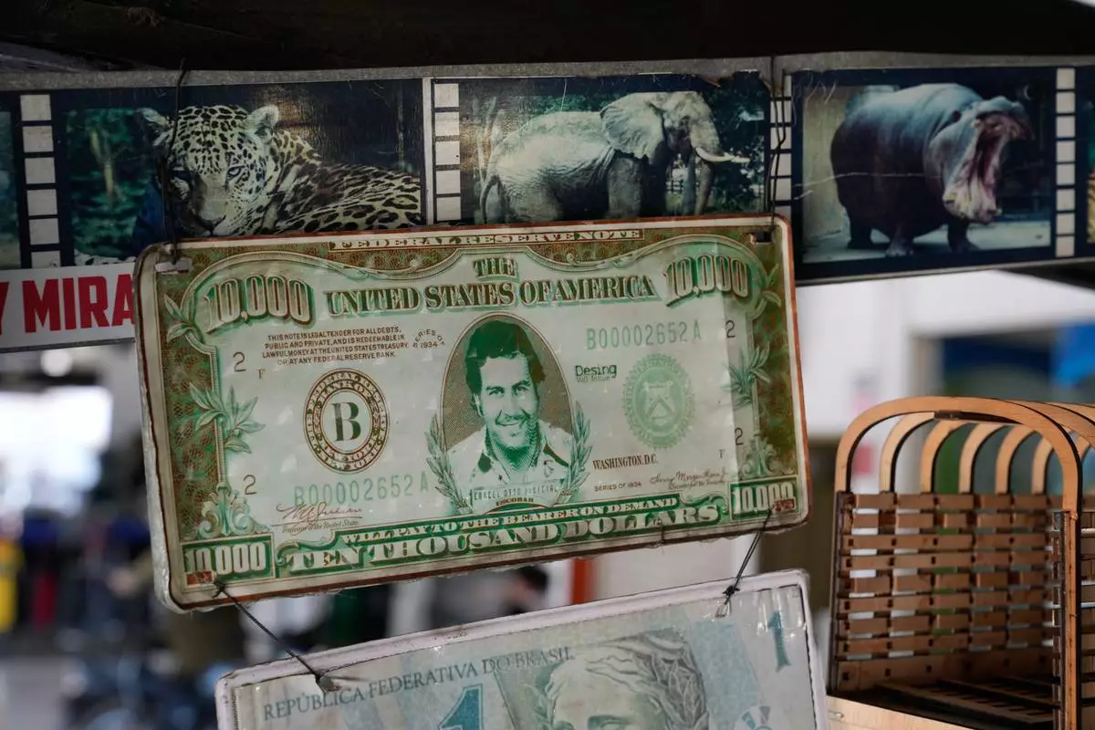 A plaque made from a dollar bill bearing the face of the late drug trafficker Pablo Escobar is displayed alongside photographs of wildlife at a souvenir store in Puerto Triunfo, Colombia, Thursday, April 23, 2026. (AP Photo/Fernando Vergara)