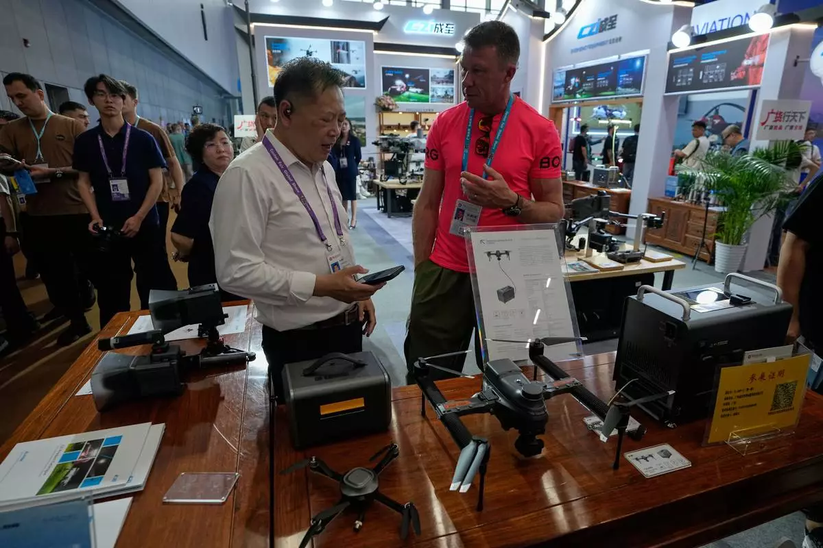 A vendor attends a visitor at a booth showcasing drones at the Canton Fair, in Guangzhou, in southern China's Guangdong province, Wednesday, April 15, 2026. (AP Photo/Andy Wong)