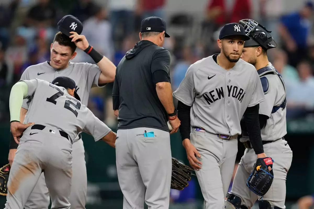 New York Yankees starting pitcher Elmer Rodriguez, right front, walks to the dugout after turning the ball over to manager Aaron Boone, center left, as José Caballero (72), Ben Rice, left rear, and J.C. Escarra, right rear, stand on the mound in the fifth inning of a baseball game against the Texas Rangers Wednesday, April 29, 2026, in Arlington, Texas. (AP Photo/Tony Gutierrez)