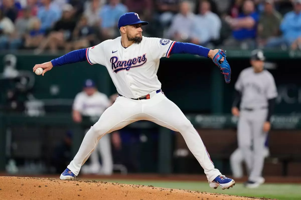 Texas Rangers pitcher Nathan Eovaldi throws to the New York Yankees in the third inning of a baseball game Wednesday, April 29, 2026, in Arlington, Texas. (AP Photo/Tony Gutierrez)