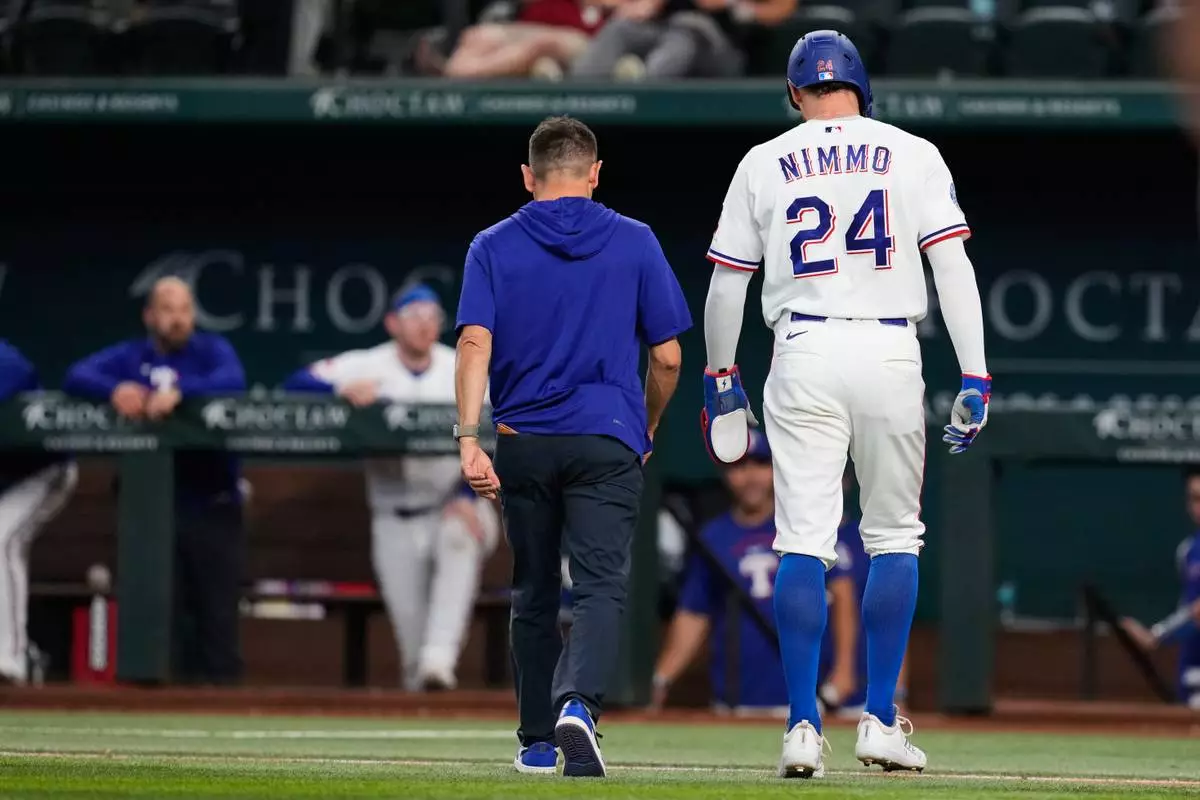 Nimmo, the Rangers' new leadoff hitter who is batting .290, said after the game he was fine and expects to be ready to play in their next game Friday.