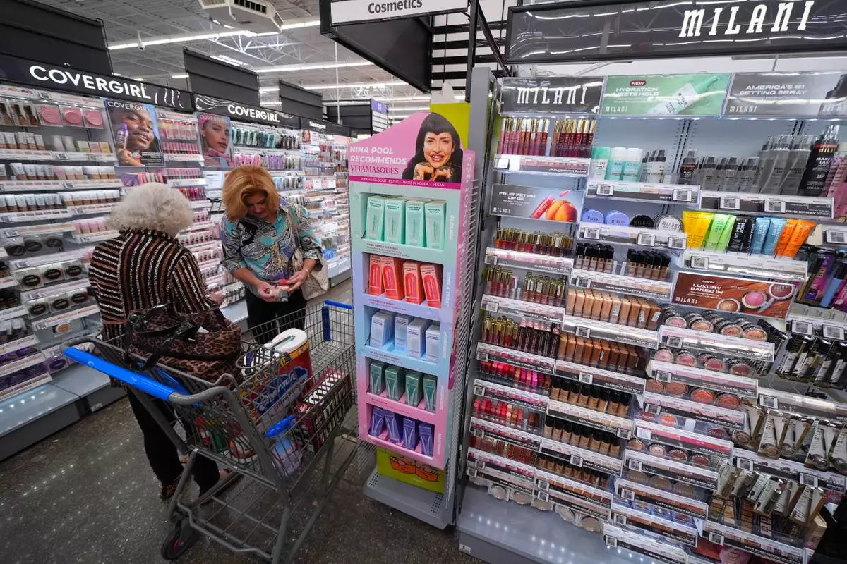 Lou Ezzell, left, and Gaylene Schueller shop cosmetics at Walmart near the store's beauty counter Wednesday, April 29, 2026, in Grapevine, Texas. (AP Photo/Julio Cortez)