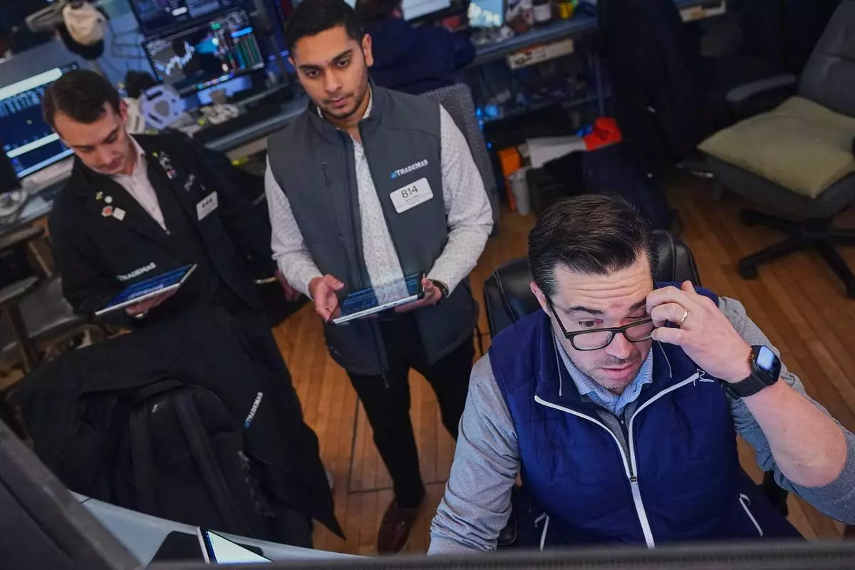 Joseph Lawler, right, works with fellow traders on the floor of the New York Stock Exchange, Thursday, April 23, 2026. (AP Photo/Richard Drew)
