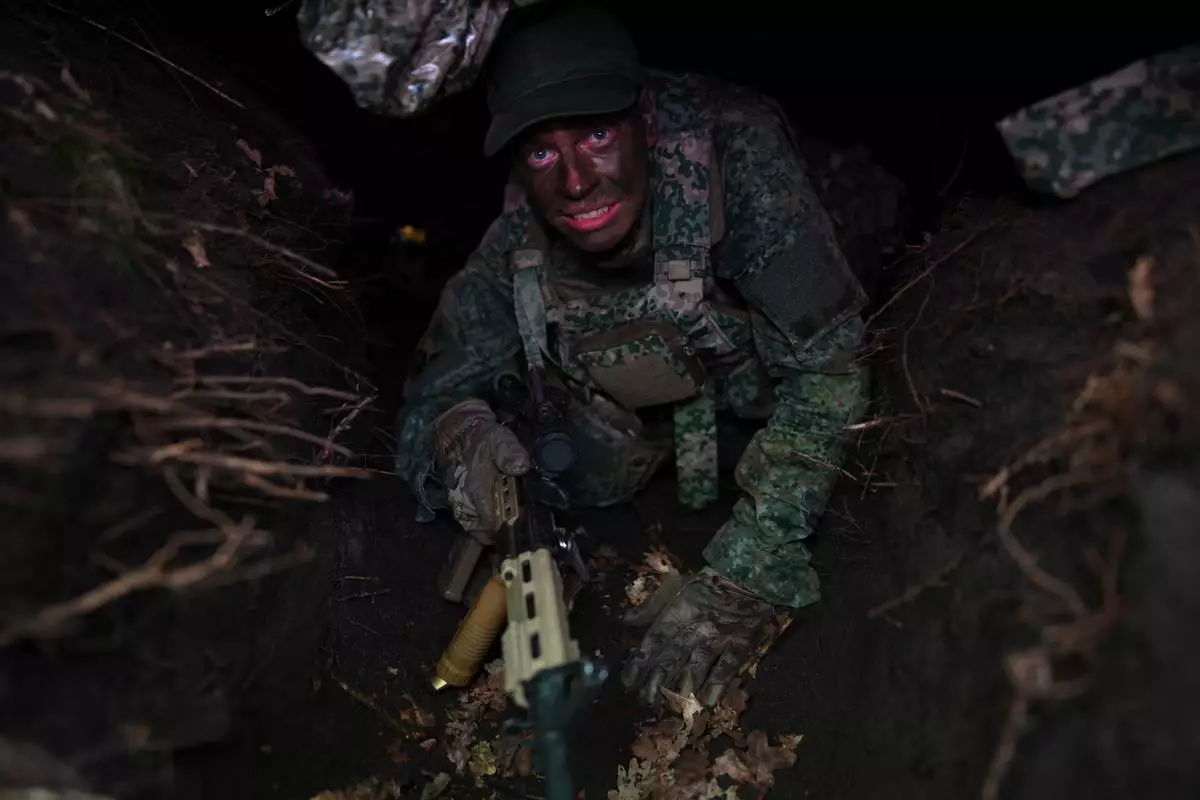 A member of the 10th Infantry Battalion Guard Security Corps National Reserve crawls out of a foxhole during a weekend exercise as the Netherlands beefs up its military with new recruits and volunteer reservists in Havelte, Netherlands, Saturday, April 25, 2026. (AP Photo/Peter Dejong)