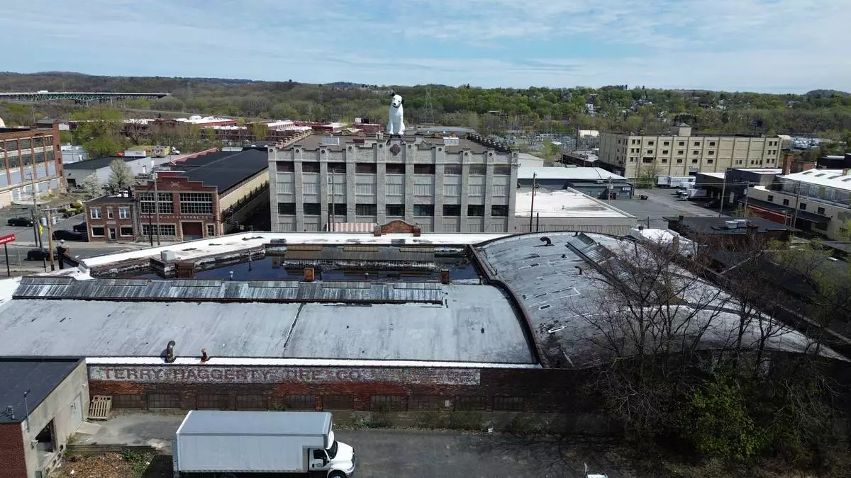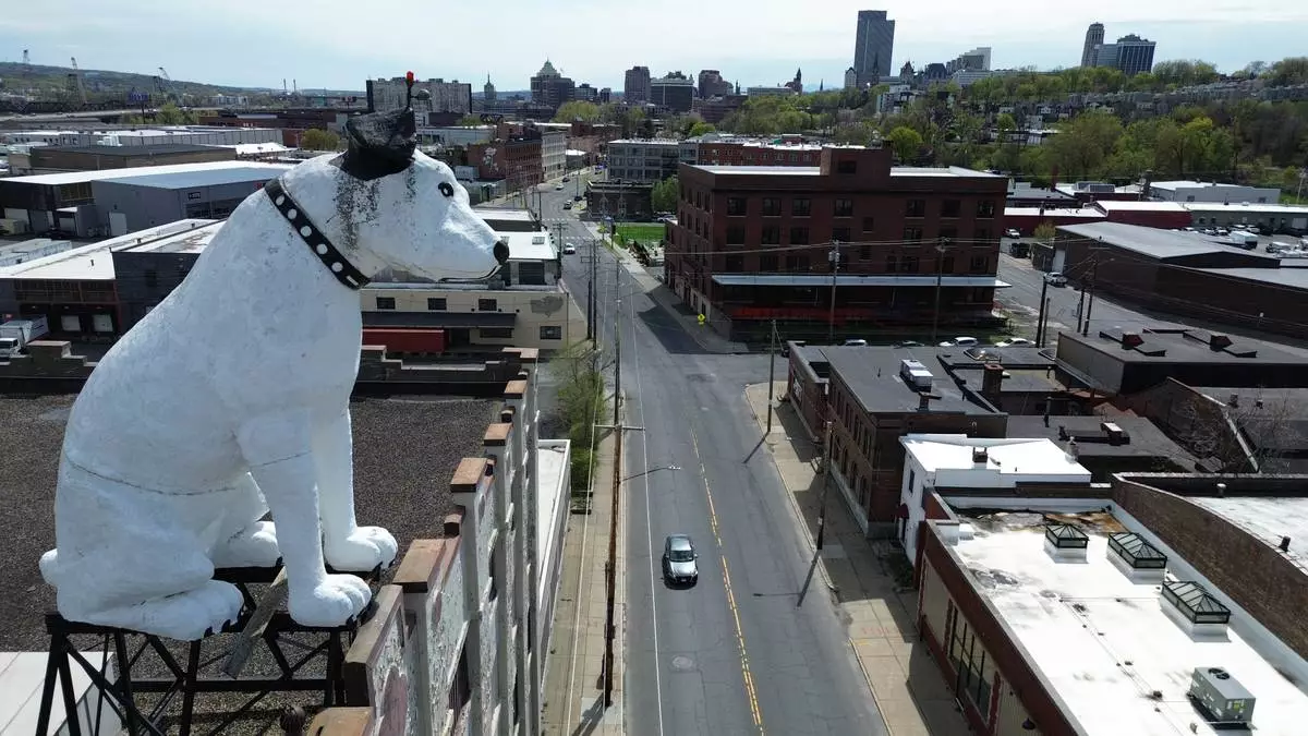 A giant statue of Nipper the dog sits atop a building in the warehouse district in Albany, N.Y., Tuesday, April 21, 2026. (AP Photo/Ted Shaffrey)