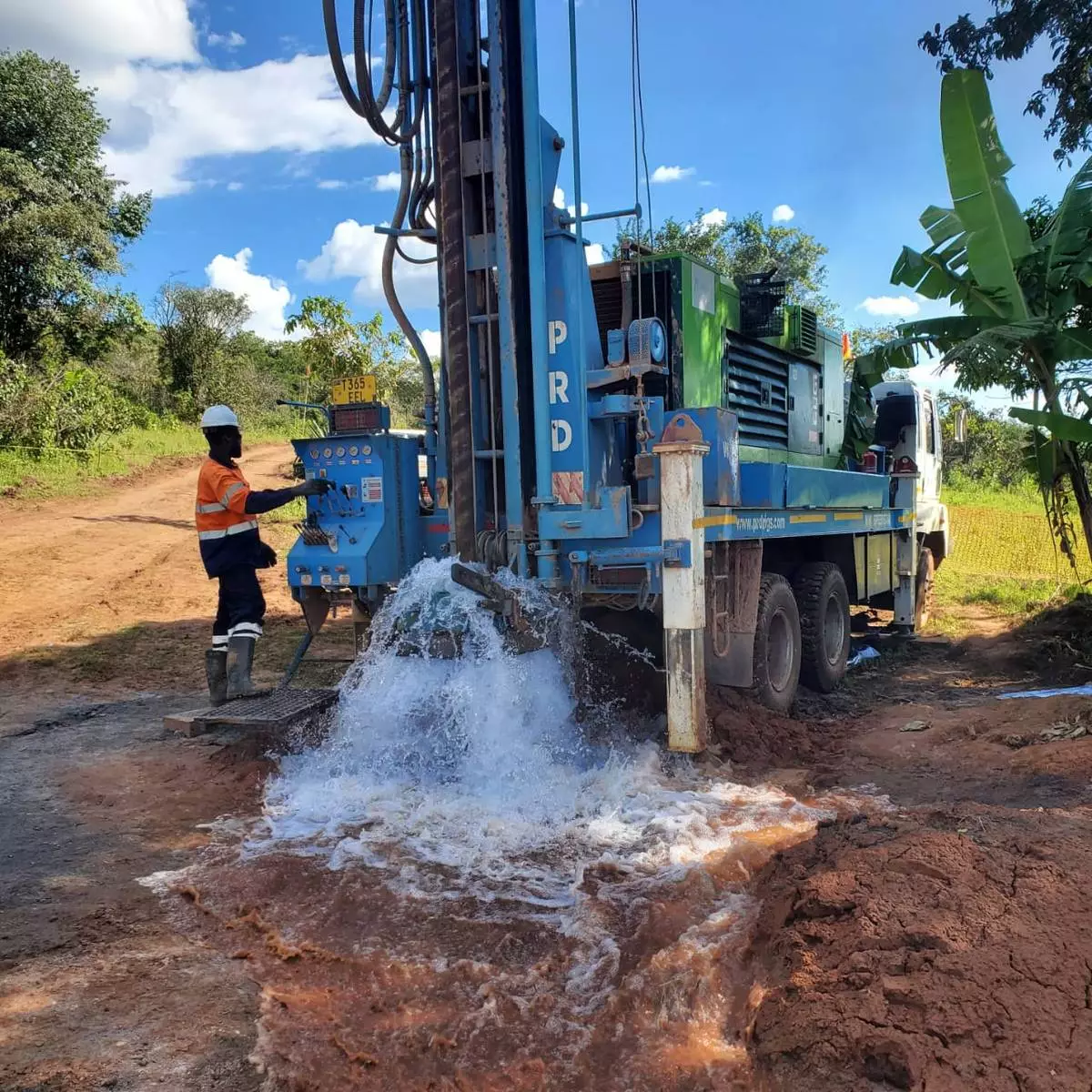 Production water borehole drilling at Kabanga Site, 132m deep, providing a yield of 28,000 L/H