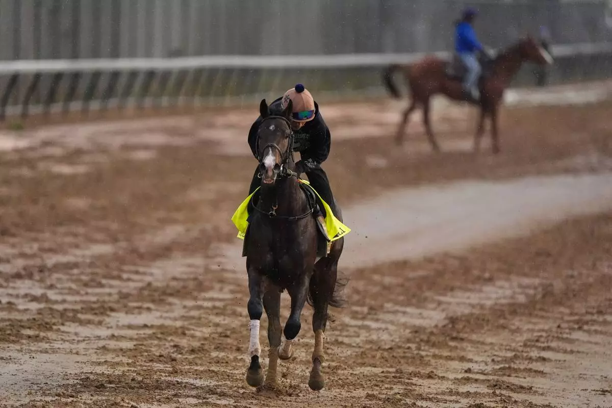 Kentucky Derby alternate Ocelli works out at Churchill Downs Wednesday, April 29, 2026, in Louisville, Ky. (AP Photo/Charlie Riedel)