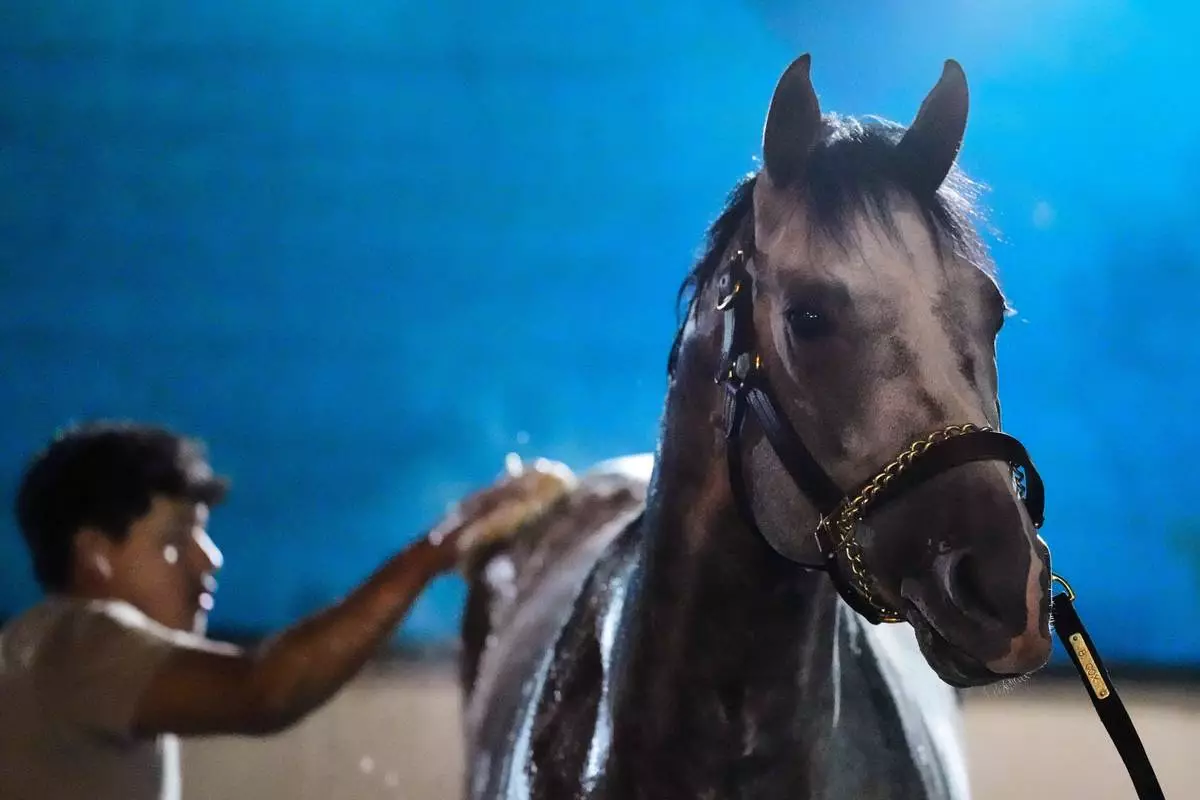 Kentucky Derby entrant Fulleffort gets a bath after a workout at Churchill Downs Monday, April 27, 2026, in Louisville, Ky. (AP Photo/Charlie Riedel)