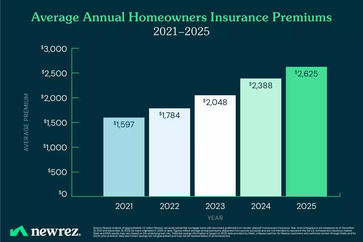 Newrez, a top five mortgage lender and servicer, today released findings from an analysis of roughly 1.2 million Newrez-serviced residential mortgage loans. According to the study, the average annual homeowners insurance premium increased 64% between year-end 2021 and year-end 2025 when the average premium grew from $1,597 to $2,625.