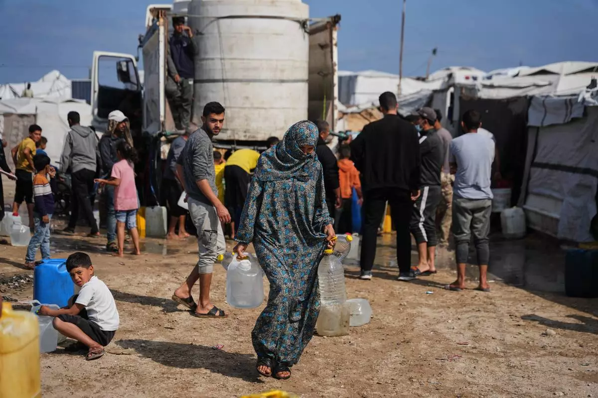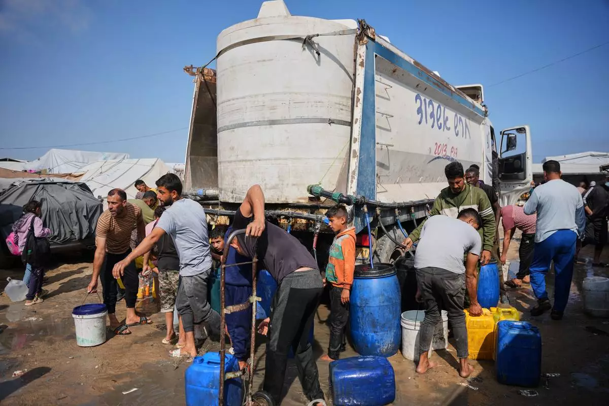 Displaced Palestinians gather to collect water from a truck at a makeshift tent camp in Khan Younis, southern Gaza Strip, Thursday, April 30, 2026. (AP Photo/Abdel Kareem Hana)