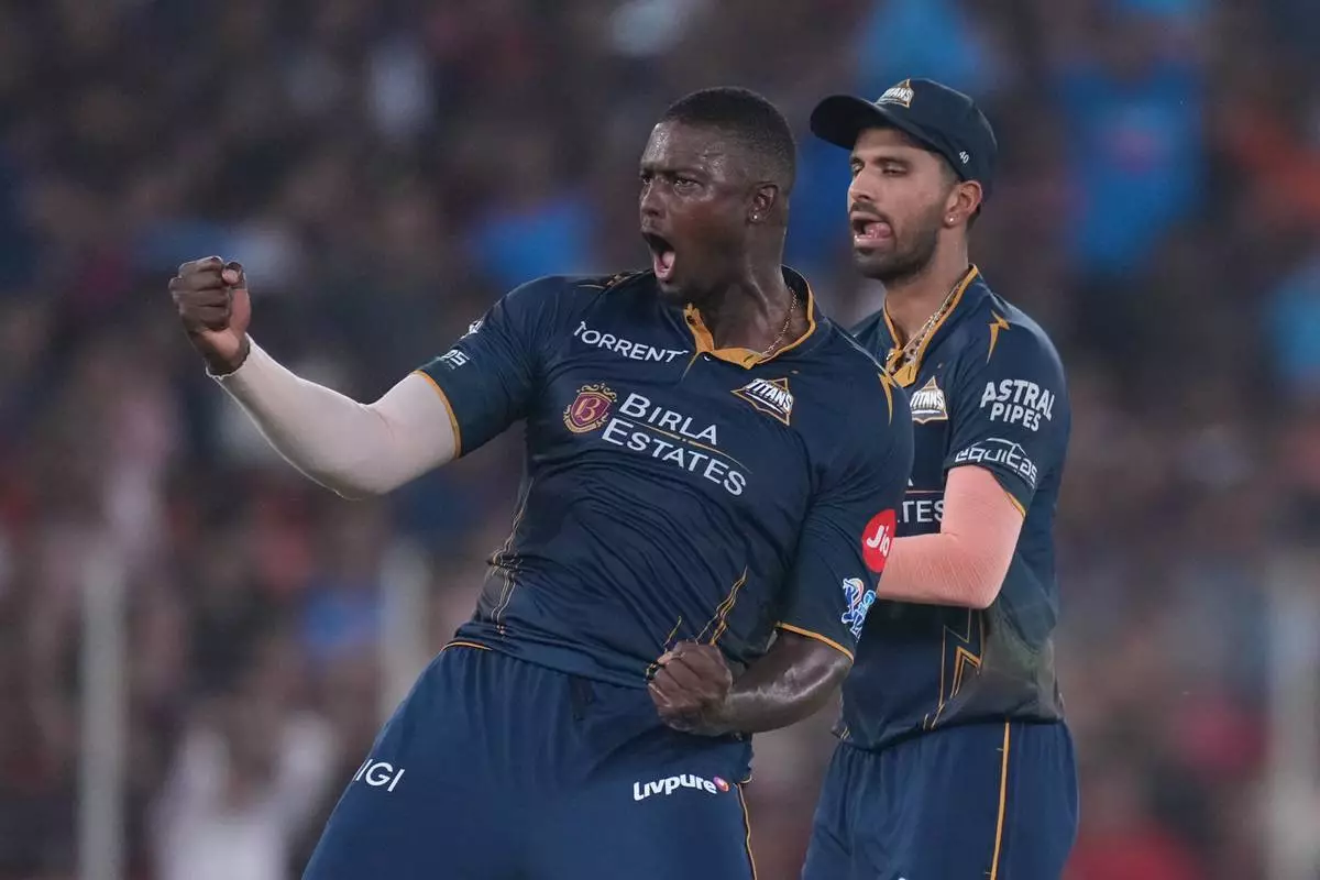 Gujarat Titans' Jason Holder celebrates the wicket of Royal Challengers Bengaluru's Jitesh Sharma during the Indian Premier League cricket match between Gujarat Titans and Royal Challengers Bengaluru in Ahmedabad, India, Thursday, April 30, 2026. (AP Photo/Ajit Solanki)