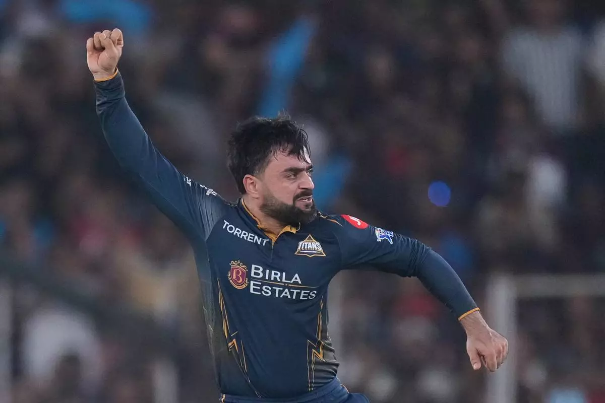 Gujarat Titans' Rashid Khan celebrates the wicket of Royal Challengers Bengaluru's Devdutt Padikkal during the Indian Premier League cricket match between Gujarat Titans and Royal Challengers Bengaluru in Ahmedabad, India, Thursday, April 30, 2026. (AP Photo/Ajit Solanki)