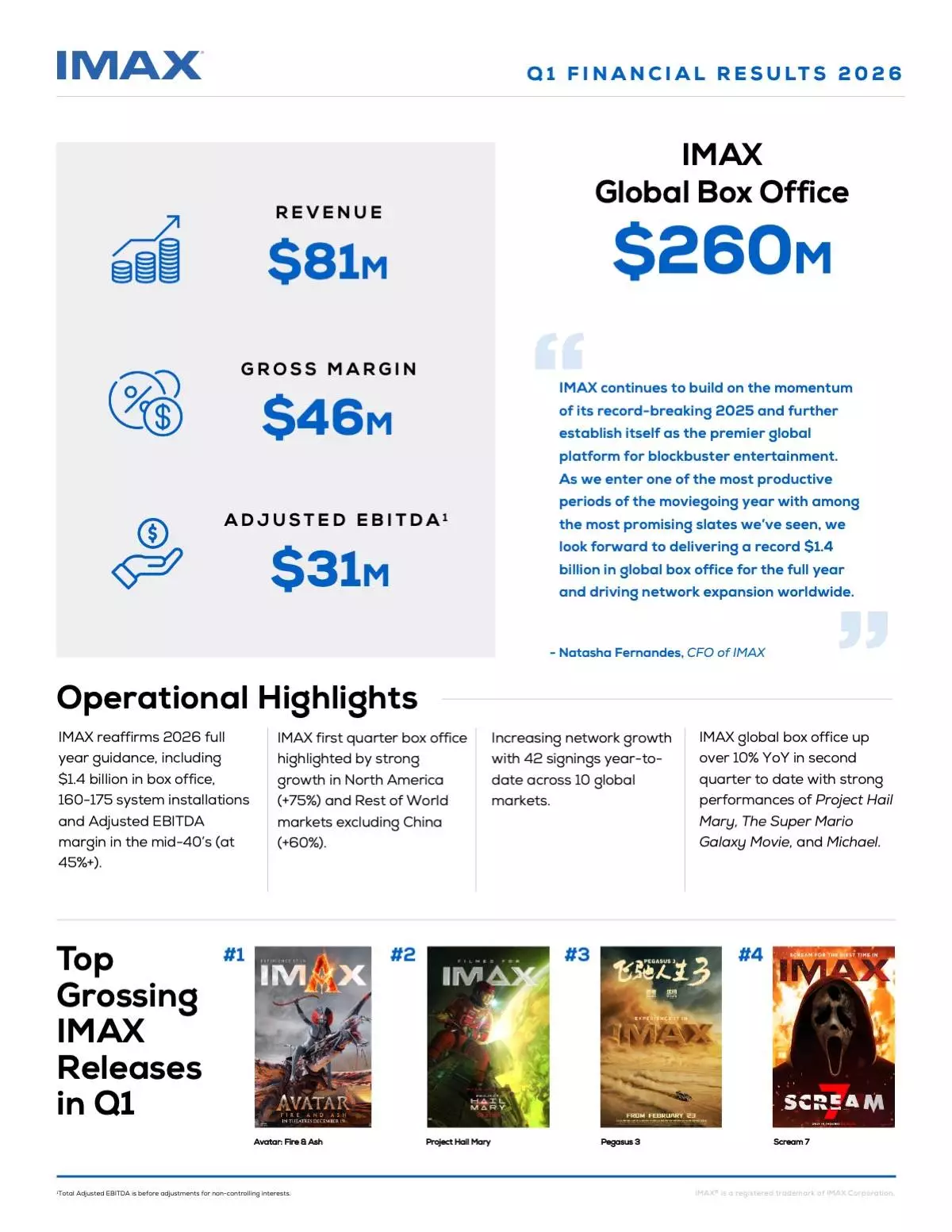 Infographic highlighting IMAX's 1Q 2026 earnings results