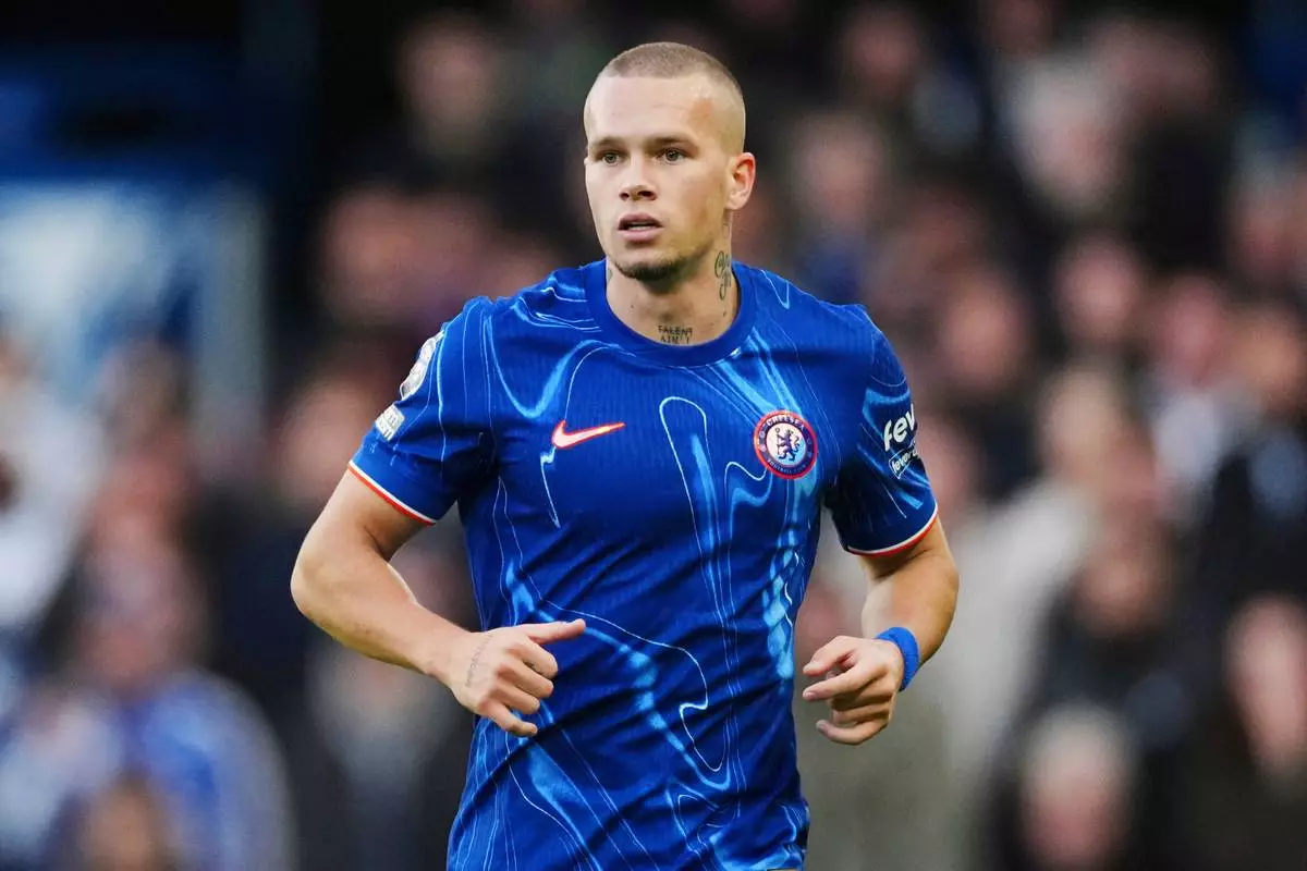 FILE - Chelsea's Mykhailo Mudryk looks on during the English Premier League soccer match between Chelsea and Newcastle at Stamford Bridge in London, on Oct. 27, 2024. (AP Photo/Dave Shopland, File)