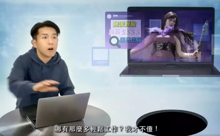 第三類就係求職騙案。騙徒會在不同求職網站,或者利用社交平台刊登虛假招聘廣,同時強調「無需經驗,高薪$$$$,即刻出糧」等,短片就提醒:「邊有咁多筍工吖,睬你都傻!」