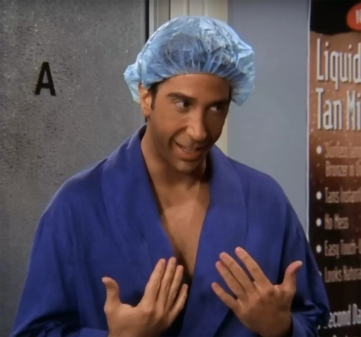 經典美劇《老友記》播出多年仍經久不衰,當中的不少畫面至今依然被粉絲津津樂道,不時分享到社交平台。當中主角之一Ross Geller有次做人工曬黑,因機器指令不明確,正面總共被噴了三次噴霧,搞笑的畫面令人印象深刻。而最近有國外女歌手分享自己也經歷一模一樣的狀況,令不少人見了都驚呼《老友記》的一幕竟真實上演。