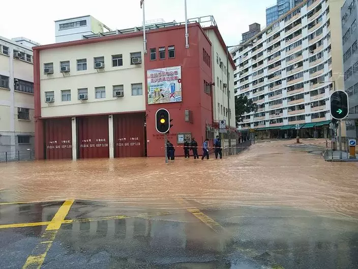 土瓜灣馬頭涌道與富寧街交界消防局對出,下午有地下水管爆裂,大量黃泥水湧出路面,波及附近消防局,行人和車輛需涉水而行。