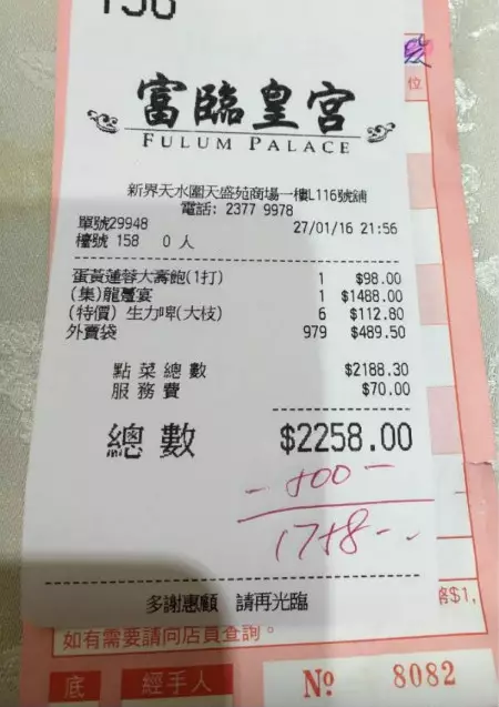 社交網站近日瘋傳一張富臨皇宮酒樓晚膳帳單,該名顧客點了「龍躉宴」,帳單除列出食物及酒水費用,最特別竟列出九百七十九個外賣袋,價值四百八十九元五角。