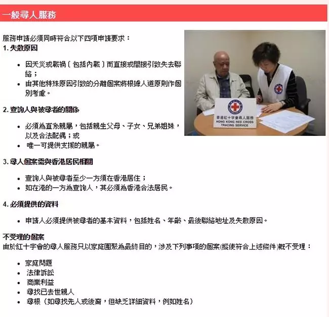 事實上,目前紅十字會亦提供尋人服務,但只限於戰亂及天災相關的個案,對於佔大多數的尋親個案,包括離家出走、中港兩地失聯等等,苦主的唯一辦法是委託偵探社代查及尋回親人。