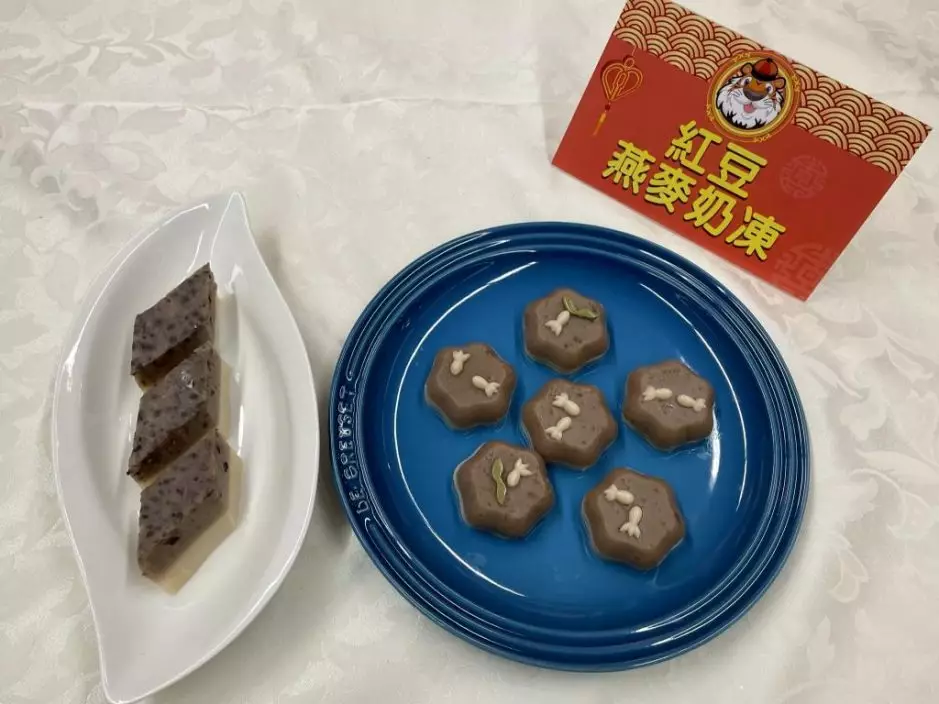 「鴻運當頭紅米脆餅配香辣豆腐醬」 「紅豆燕麥奶凍」。