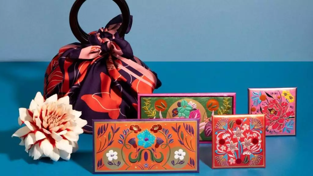 「繁花盛放迎豐年」利市封上的牡丹、蘭花、水仙和火鶴花以立體浮雕設計配金銀線繡。(時代廣場 )