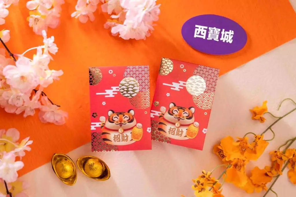 以圓碌碌可愛造型的「福」虎為主角,集合達摩及招財貓和大家招運許願,兼招財祝福。利是封更配以紅色為主色調,再拼上華麗的青海波及彩雲等燙金圖案。 以電子貨幣即日單一消費滿指定金額(西寶城及昇悅商場$200、昇御商場$100)即可換領1套8個的利是封。