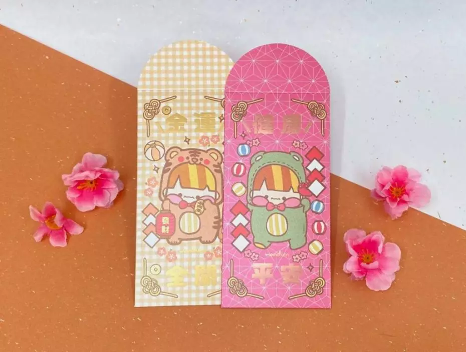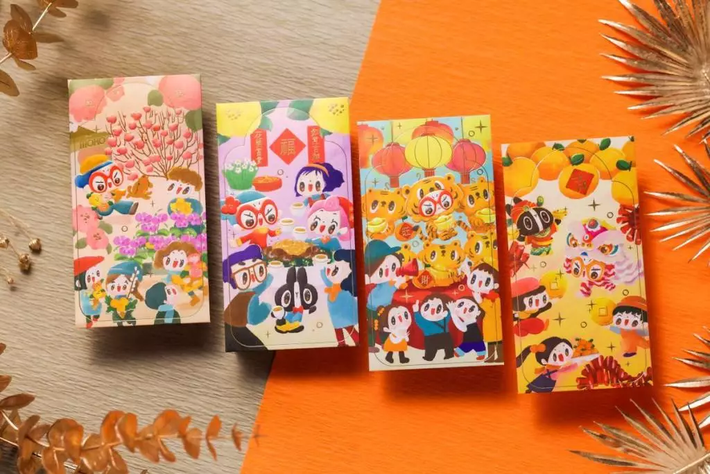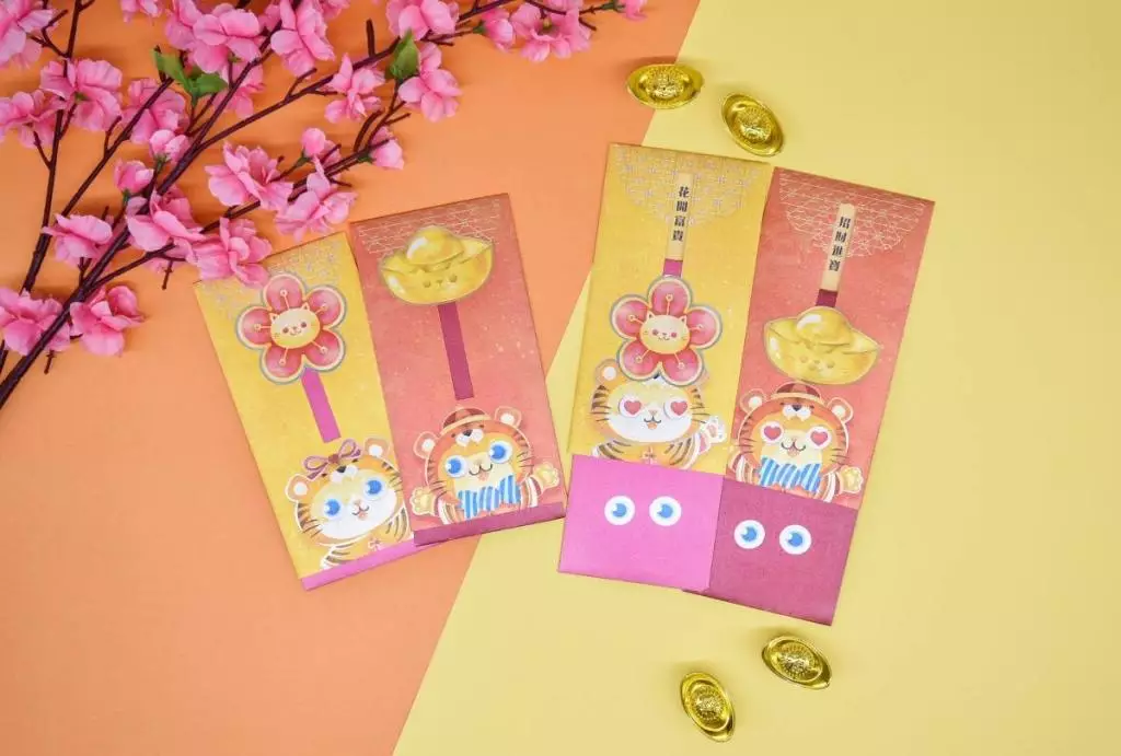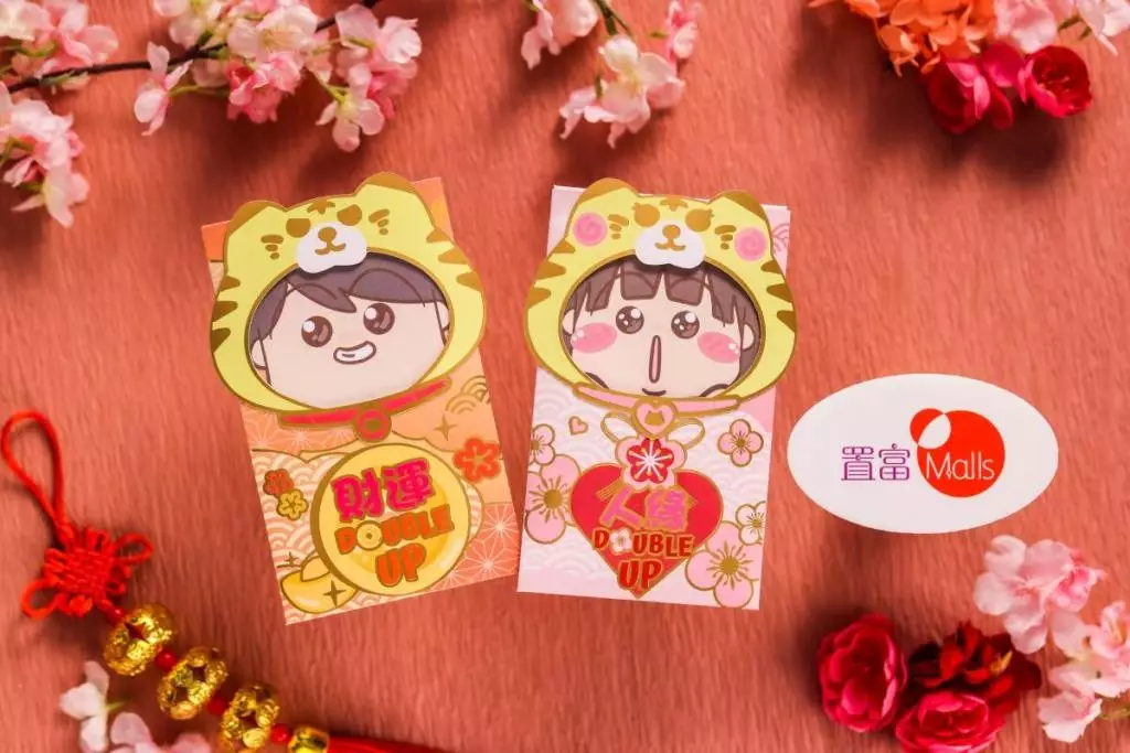 1套2款共8個的利是封分別是祈求人緣運的小妹 x DD紅粉桃花款式,以及祈求財運的大大 x 雪比閃耀金幣款式,利是封印上燙金萌虎頭套,只要上下拉動封套,不同角色將輪流換上萌虎造型,可愛度爆燈。Fortune+會員凡於置富Malls以下指定單一商場(+WOO嘉湖、置富第一城、置富都會、馬鞍山廣場、都會駅)內任何2間不同商戶累積消費滿$500,或到Fortune Malls App使用Point+即可換領。