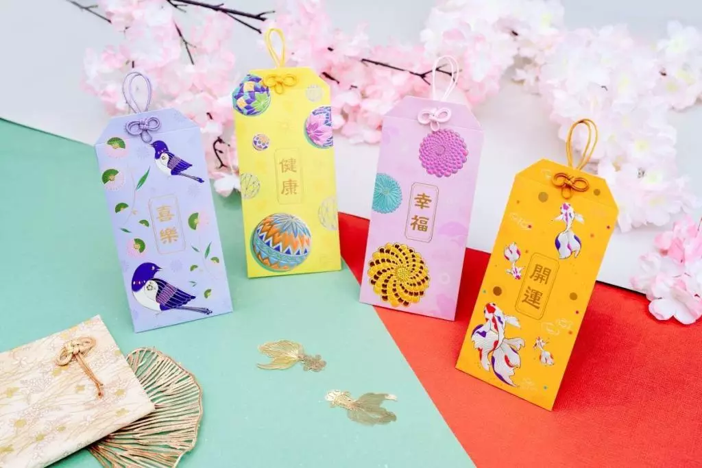 御守造型的利市封分別以金魚、蹴鞠、喜鵲及繁花為主題。(YOHO MALL)