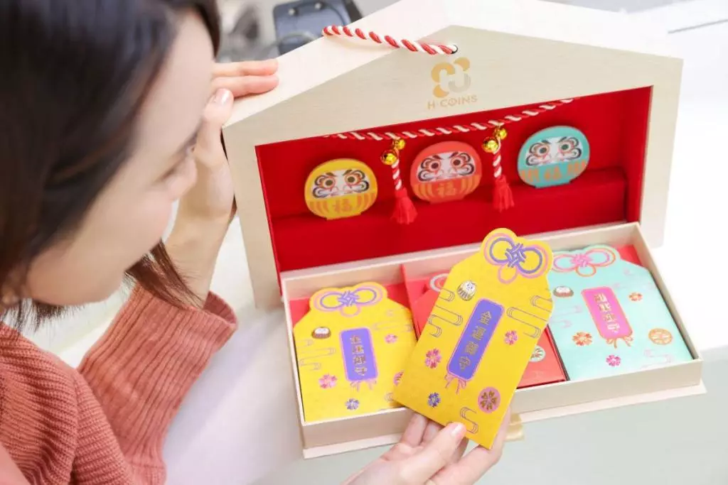 以繪馬盒作為包裝禮盒,配上3個達摩不倒翁,內有一套3款、每款4個以健康、開運及金運為主題的御守造型利是封。利是封採用立體刺繡工藝,封口位置特別印上代表「平安如意」的如意結,只要打開封口,即如開啟好意頭的景象,迎接滿滿的祝福。H•COINS會員只可以1,888 COINS(新春祈願繪馬盒連御守造型利是封套裝)或688 COINS(御守造型利是封)即可免費換領。7大商場包括MCP CENTRAL & MCP DISCOVERY(新都城中心2期及3期)、MOSTown新港城中心、荃灣千色匯、元朗千色匯、沙田中心.沙田廣場、屯門時代廣場及利奧坊。